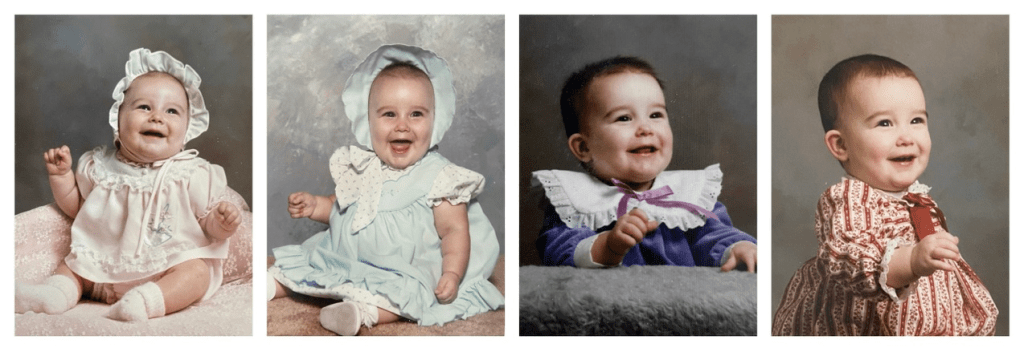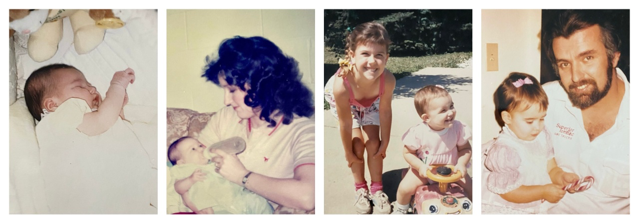 Megan at 4 days old, 2 months old with me, 18 months old with Michelle, and almost 2 years old with dad.