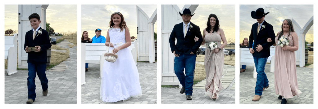 While I’m normally as cool as a cucumber, my nerves were a little shaken at this point as the wedding was just about ready to start. Tears filled my eyes as I was frantically scrubbing my dress in the bathroom sink, and simultaneously asking God to calm my nerves. My dress was soaking wet but thanks to a bunch of paper towels and the Texas sun it was partially dried as I walked down the aisle escorted by our grandson, Colby.